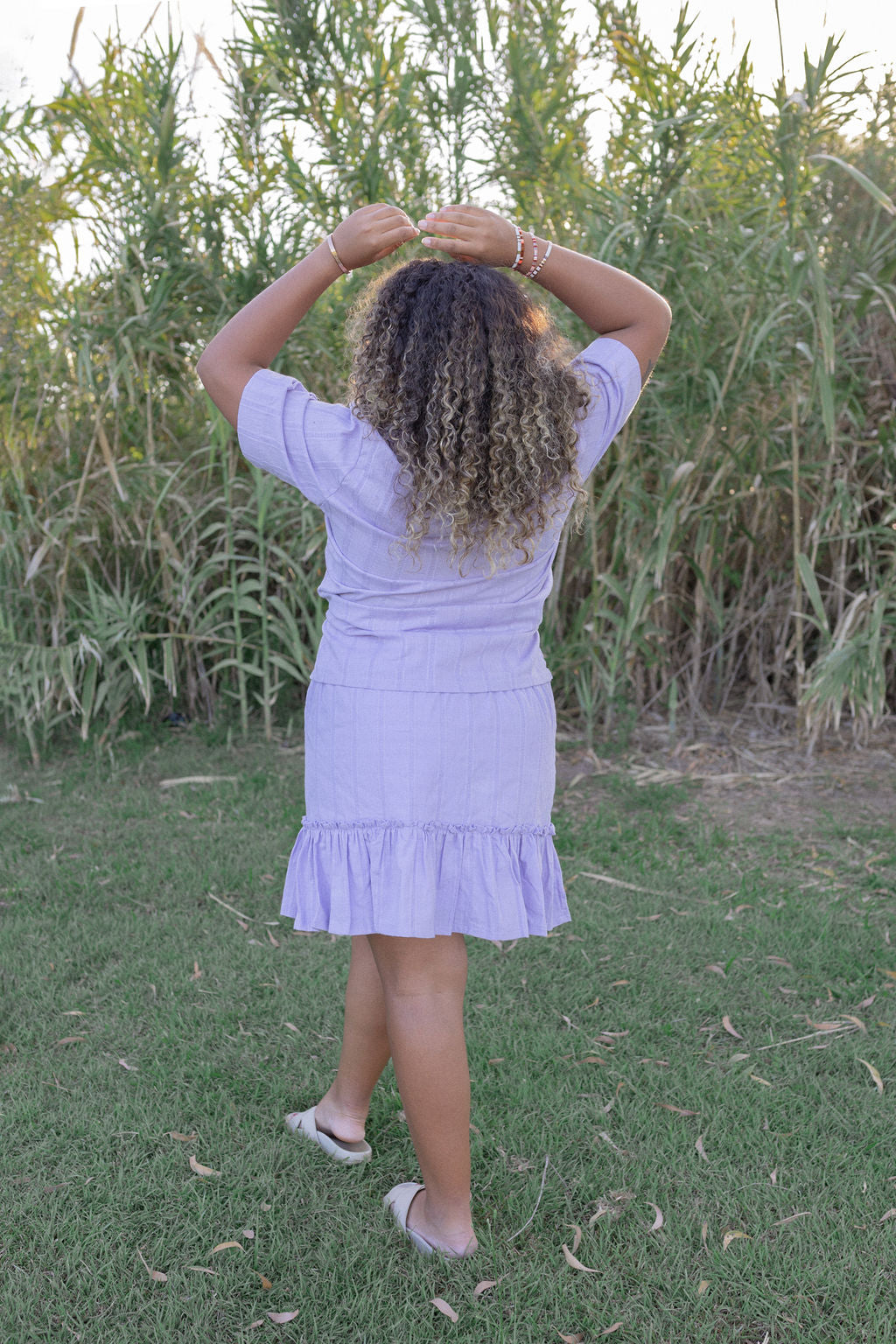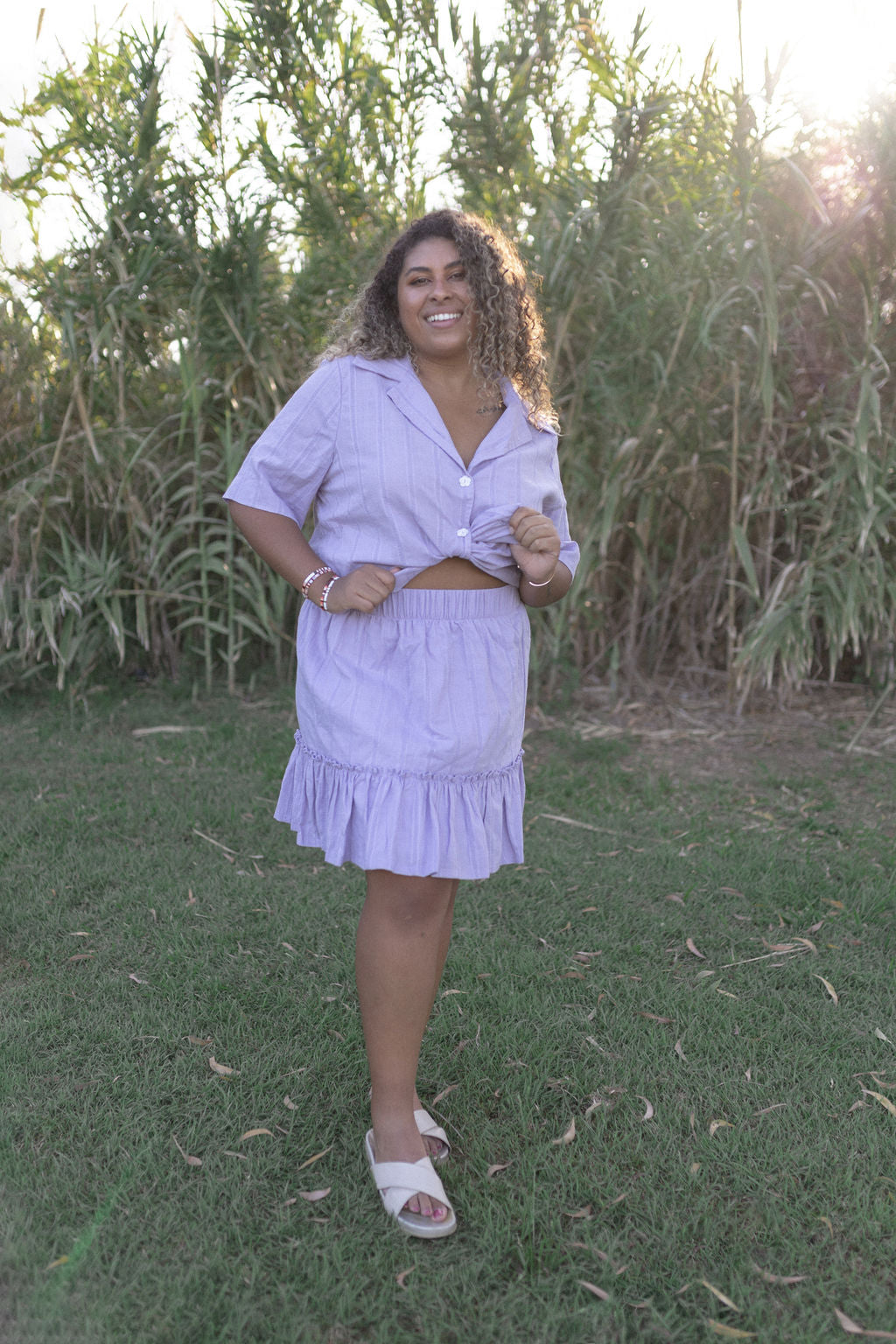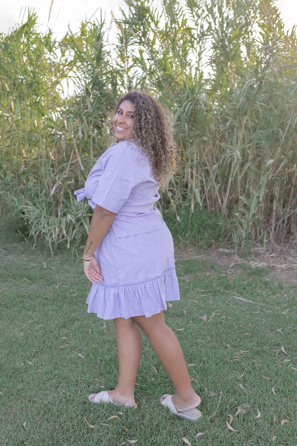 - Chose between White Crinkle Cotton or Lilac Striped Cotton