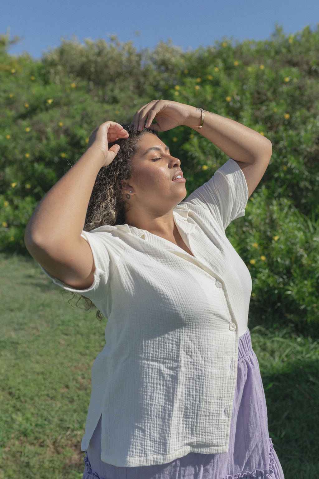 - Loose fitting, button up shirt